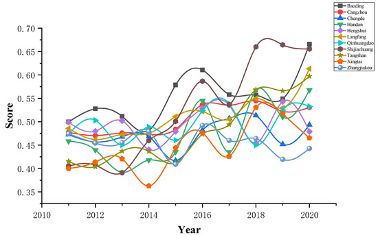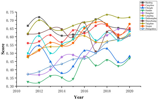 According to the coordinated evaluation results of water use and industrial ecosystem development in Hebei Province from 2011 to 2020, it can be seen from the time dimension that the coupling coordination degree of each city has shown a trend of fluctuation and rising over the years, and the range of change is not large. The coupling coordination degree of each city is between 0.4 and 0.6. The coupling coordination degree is on the verge of imbalance or barely coordinated. From the perspective of spatial dimension, except Chengde City, where the coupling coordination degree is fluctuating, the coupling coordination degree of other cities shows an overall upward trend. Baoding, Cangzhou, Langfang, Shijiazhuang, and Tangshan City have a relatively good coupling coordination degree, which is at a barely coordinated degree, while other cities are at a near imbalance or barely coordinated degree. Baoding, Cangzhou, Shijiazhuang, and Tangshan City have better performance in water use, while Baoding Langfang, Shijiazhuang, and Tangshan have performed well in the development of industrial ecosystems. It can be seen that the improvement in coupling coordination degree must be caused by the simultaneous increase in the scores of water use and industrial development, or the increase on one side and the fluctuation trend on the other side.