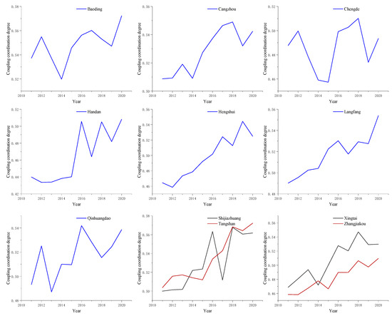 Second, according to the results of the coordination evaluation, the coordination degree of cities in Hebei Province in 2016 showed a significant improvement trend compared with 2015, and the coupling coordination degree of some cities showed fluctuations after 2016.