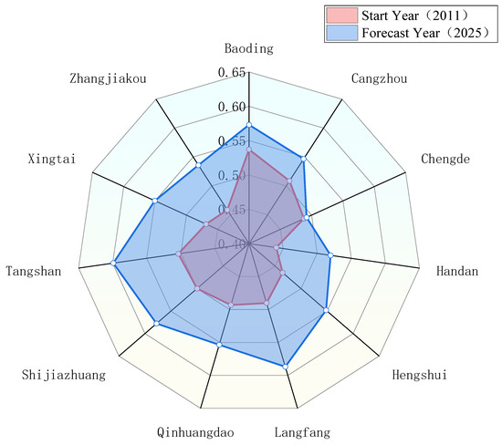 According to the coordinated forecast results of water use and industrial ecosystem development in Hebei Province, the coupling coordination degree of each city has not changed much compared with 2011–2020. Except for Chengde, which is on the verge of imbalance, other cities have reached a barely coordinated degree. As shown in Figure 8, compared with the start year (2011), the coupling and coordination degree of each city in the forecast year (2025) has improved, and the maximum growth rate of Langfang City is 0.0967. By 2025, the order of coupling coordination degrees of cities from high to low will be Tangshan, Langfang, Shijiazhuang, Baoding, Qinhuangdao, Xingtai, Hengshui, Cangzhou, Zhangjiakou, Handan, and Chengde.
