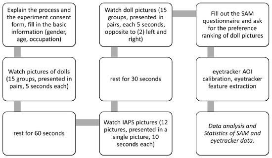 The recruitment conditions for this study were that participants were over 20 years of age, with vision correction of over 0.8, were male or female, and had normal sleep. A total of 37 subjects were recruited, aged 20 to 28. The mean age was 23.55 ± 2.26. The subjects were all familiar with the experimental procedure in advance and also filled out the consent form. They were required to complete the eye tracker measurement and SAM ranking for soothing dolls. The study was reviewed by the Research Ethics Committee of China Medical University Hospital in February 2022 (IRB number CRREC-110-133).