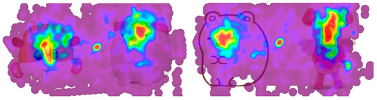 The typical heat maps of three dolls are demonstrated in Figure 4. From Figure 4, it can be found that the eye area is the main focus area of the three dolls, and the other peripheral areas of the dolls receive less attention. The center point of the picture has an additional red focus, which may be the result of the movement of the eyes of the two dolls, which do not attract the subjects.