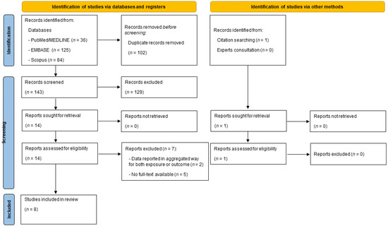 After the first screening based on the title and abstract, a total of 14 papers were considered eligible. However, seven papers were removed after full text assessment because five papers were conference abstracts (full text was not available) [26,27,28,29,30]; one paper reported results between a combined lifestyle score (including adherence to the MedDiet) and risk of PC [31], and the last paper combined data for PC and other gastrointestinal cancers [32]. A detailed description of the excluded reasons is reported in Supplementary Table S1. At the end of the screening process, a total of eight articles were included in the current systematic review [33,34,35,36,37,38,39,40], of which seven came from the databases and registers screening process [34,35,36,37,38,39,40], and the other was identified from citation searching [33]. Consultation with experts did not add any further eligible studies. The full selection process is depicted in detail in Figure 1.