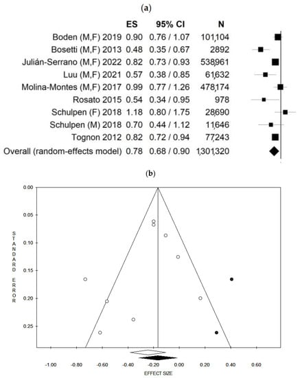 In order to highlight the differences between males and females, a subgroup analysis based on sex was also performed. In particular, when studies only assessing the risk among males were included, and using the random effect model, the HR was 0.89 [(95% CI = 0.78–1.01); p = 0.061], with an inverse weak borderline statistical significance, and with high statistical heterogeneity (I2 = 76.82, p-value = 0.001). A statistically significant publication bias was found after visual inspection of the funnel plot (Supplementary Figure S6b), as confirmed by the Egger’s linear regression test (Intercept −0.10, p-value = 0.947). After applying the trim and fill method, the estimated ES using both the fixed and random effect models remained similar. The results are reported in Table 6.