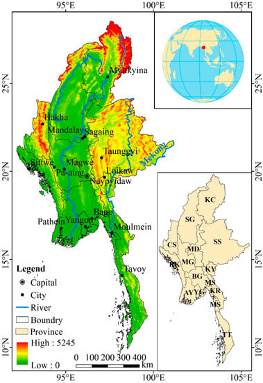 Myanmar is in the northwestern part of the Indochina Peninsula (9°58′–28°31′ N, 92°20′–101°11′ E) (Figure 1). Myanmar is bordered by China in the north. It is connected to Laos and Thailand in the east. It is bordered to the southwest by the Andaman Sea and the Bay of Bengal in the Indian Ocean. It is bordered by Bangladesh and India to the northwest. The total land area is 67.66 × 104 km2, and the coastline is 0.28 × 104 km. Myanmar has high terrain in the north and low terrain in the south. It is surrounded by mountain ranges in the north, west, and east. It has high mountainous areas in the north (the Savage Mountains, also known as the Kachin Mountains, the Kumaon Ridge, and the Hukawng Valley Mountains). The Rakhine Mountains and the Naga Hills are in its western part. The Shan State plateau is to the east of it. Khyakabo Peak, near the Chinese border, is 5881 meters above sea level and is the highest peak in Myanmar. The Irrawaddy alluvial plain lies between its western mountains and eastern plateau. The terrain is low and flat, with an average elevation of 200 meters to 600 meters.