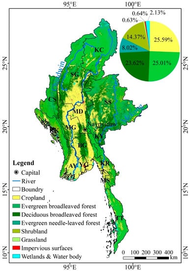 We downloaded the GLC_FCS30 dataset for the study from the China Earth Big Data Science Project Data Sharing Service (https://data.casearth.cn/, accessed on 30 October 2022). The spatial resolution of this dataset is 30 meters. It covers the period 1985–2020. Among them, every 5 years is 1 time period. It has a total of 8 time periods []. There are two levels of land cover types. Among them, there are 9 first-level types and 30 second-level types (Table 1), with classification accuracies of 82.5% and 68.7%, respectively []. There are 22 second-class land types in Myanmar (Table 2). In Myanmar, forests cover more than half of the total area of the country. We would like to study it in more detail and conclude the distribution and changes of each specific type of forest in Myanmar. So, only forests used Tier 2 land types in the study. All other land types used Tier 1 land types. The areas of bare areas and permanent snow and ice were extremely small. We merged bare areas into grasslands. We merged permanent snow and ice into wetlands & water bodies.