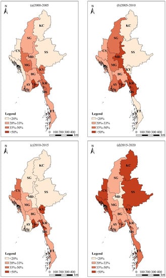 Our research shows that from 2000 to 2020, the area of evergreen broad-leaved forests and deciduous broad-leaved forests in Myanmar decreased. The area of the rest of the land types increased. Among them, the absolute area of shrubland increased the most. This result is the same as the regional-scale research results of Wang et al. [] in Yangon, Karki et al. [] in Inle Lake, and McGinn et al. [] in the Chindwin River Basin. All of their studies also indicate that the forest area decreased, and the areas of shrubland, grassland, impervious surfaces, and wetlands all increased within the study area. The changing trend of LUCC in Myanmar is similar to that of other Indochina countries. Research by Hu et al. [], Zhang et al. [], and Niu et al. [] in Vietnam, Laos, Cambodia, and other countries also found the phenomenon of shrinking forests, shrubland, and the expansion of impervious surfaces.