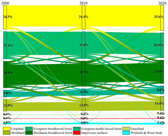 During 2000–2020, the land area where transfer between different LUC types occurred in Myanmar was 18.51 × 104 km2. From 2000 to 2010, the land area where LUC types were transferred in Myanmar was 14.39 × 104 km2, and from 2010 to 2020, the area of transferred land was 16.84 × 104 km2. The conversion process mainly occurs between two land use/cover types (Figure 4), including cropland and deciduous broad-leaved forest, evergreen broad-leaved forest and shrubland, deciduous broad-leaved forest and shrubland, evergreen broad-leaved forest and evergreen needle-leaved forest, and evergreen broad-leaved forest and deciduous broad-leaved forest.