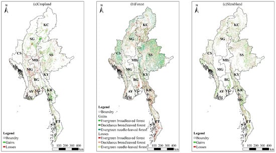 Among them, the total area of evergreen broad-leaved forest transformed into other land types was 4.72 × 104 km2, mainly transformed into shrubland (−48.10%, −2.27 × 104 km2), evergreen needle-leaved forest (−26.36%, −1.24 × 104 km2), and deciduous broad-leaved forest (−19.36%, −0.91 × 104 km2). The total area of other land converted to the evergreen broad-leaved forest was 2.84 × 104 km2, mainly from shrubland (+37.51%, +1.06 × 104 km2), deciduous broad-leaved forest (+32.16%, +0.91 × 104 km2), and evergreen needle-leaved forest (+27.25%, +0.77 × 104 km2). The shrinking evergreen broad-leaved forests are mainly distributed in Kachin State, Sagaing, Rakhine, etc., in the northern and western mountains and Tanintharyi, Karen State, etc., in the south. The expansion is mainly distributed in Chin State, etc., in the western mountainous areas, and Shan State, etc., in the eastern plateau.