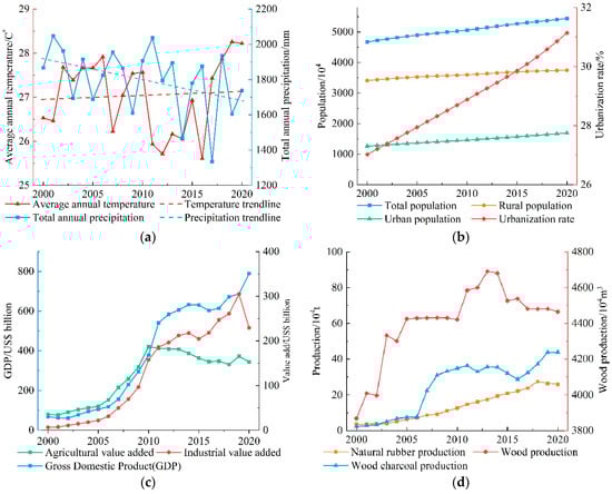 Development status in Myanmar from 2000 to 2020. (a) Climate factors; (b) demographic factors; (c) economic factors; (d) forestry factors; and (e) agricultural factors.