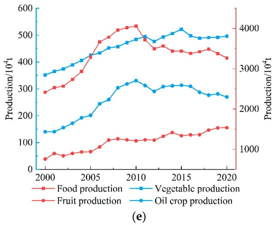 From 2000 to 2020, the overall development of agriculture in Myanmar showed an increasing trend (Figure 6e). Vegetable production declined slightly in 2012 and then increased year by year. In 2016, it began to decline slowly and fluctuated, maintaining at about 490 × 104 t, and reached a peak in 2015 (522.25 × 104 t). Oil crop production continued to rise before 2010, then fluctuated slowly, and reached a peak in 2010 (330.57 × 104 t). Food production continued to rise before 2010, then declined, and reached a peak in 2010 (4061.62 × 104 t). The overall fruit production is on the rise, from 757.57 × 104 t in 2000 to 1536.36 × 104 t in 2020, an increase of 778.79 × 104 t. It grew at an annual rate of 3.60%.