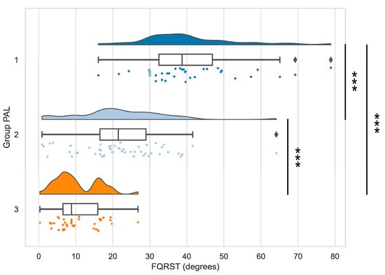 The analysis of the differences between groups revealed statistically significant results for FQRST (p < 0.001) when comparing groups 1 and 2, 2 and 3, and, respectively, 1 and 3. In our statistical analysis, we used the value of the Bonferroni-corrected threshold of statistical significance of 0.016. The magnitude of the differences between the data series indicated a large effect size (r > 0.5), according to the r classification system []. The raincloud plot of the distributions of FQRST data depending on the PAL level is presented in Figure 1 [].