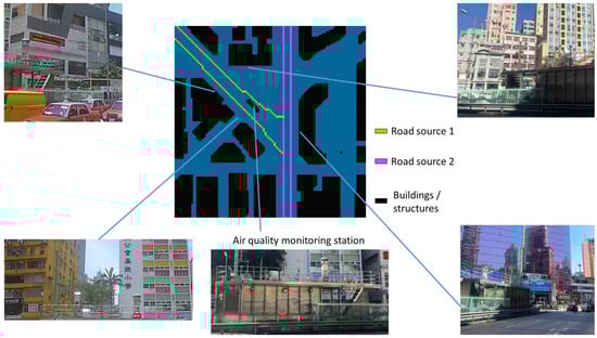This study was conducted within a densely populated urban environment of Hong Kong (22.30° N, 114.17° E). The study site (Figure 1) is featured with a road-side air quality monitoring station operated by the Hong Kong Environmental Protection Department (EPD), two major roads, and sparse vegetation, and it is surrounded by buildings with different heights (5–26 stories). The subsequent section details the ANN and CFD models used here.