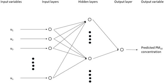 The ANN (an ML algorithm) model was formulated to predict the neighborhood-scale PM10 dispersion within the UCL of the study site. The model mimics natural neurons in animal brains. The details of the model have been discussed elsewhere, e.g., [27]. Briefly, the ANN model consists of interconnected neurons at the input, hidden, and output layers (Figure 2). Input values are collected in the input layer and then sent to different neurons (or processing units), which constitute the hidden layer. Output variables are eventually obtained at the output layer after the data are processed. Each neuron in the hidden layer computes a weighted sum of the inputs. The weight is subjected to change during the ANN training in order to provide its best estimate to the output. The selection of a proper number of hidden layer is important for the model construction. Although adding more hidden layer might improve the model’s performance, it is noted that more complexity of the training process is imposed [28]. Therefore, one hidden layer was used here. The number of neurons in the hidden layer was determined by Nhidden = 2 Ninput + 1, where Nhidden and Ninput are the number of neurons in the hidden and input layers, respectively [29]. To avoid model instability, all input parameters were scaled from 0 to 1. The feed-forward neural network was used, which was successfully adopted in other pollution transport studies, e.g., [30]. It is called the feed-forward network since data flow within the network from one layer to the next one without any return path. A hyperbolic tangent sigmoid transfer function for the neurons in the hidden layer was adopted to reduce the computational time required during the training process. The efficient Levenberg–Marquardt algorithm for training was used, such that the model achieved a mean squared error (MSE) < 0.004. The model was constructed by the MATLAB software (The MathWorks, USA). Table 1 details the model settings.