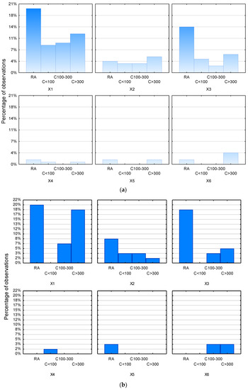 (a). Places of women’s daily food shopping. Histogram categorized by the variable place of residence. (b). Places of men’s daily food shopping. Histogram categorized by the variable place of residence. Abbreviations: X1-hypermarket, X2-via internet, X3-local store, X4-wholesale (cash and carry wholesalers), X5-armer, X6-marketplace, RA-rural, C100-city with up to 100,000 residents, C100–300-city with 100,000–300,000 residents, C > 300-city with more than 300,000 residents.