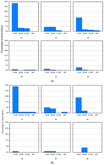 (a). Places of women’s daily food shopping. Histogram categorized by the variable age. (b). Places of men’s daily food shopping. Histogram categorized by the variable age. Abbreviations: X1, hypermarket; X2, via internet; X3, local store; X4, wholesale; X5, farmer; X6, marketplace; 19–25 years; 26–40, 26–40 years; 41–60, 41–60 years; >60, more than 60 years.
