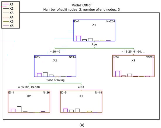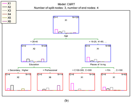 The CART (Classification and Regression Trees) method was used to classify the dataset. This is a nonparametric discrimination method that is gaining increasing popularity in research where the growth in information and data volume has resulted in a sudden increase in the need to analyse them [55,56]. The purpose of this method is to group and divide objects based on distinguished characteristics. It enables the automatic search for patterns and relationships in large data sets, organizing them into concise models. As a result, data mining techniques have quickly found application in marketing data analysis, including in segmentation studies and market selectivity studies [56,57].