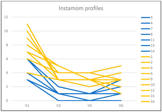 Figure 1 graphically represents the profiles of the Instamoms. It can be seen that the frequency of use of minors is lower in the profiles of the Instamoms of cluster 1 (blue lines) compared to the profiles of the Instamoms of cluster 2 (yellow lines). Finally, we compared the impact of the posts between the two clusters, obtaining significance (p = 0.030) in the case of the situation in which at least one minor is present, but not in the other two situations in which the mother appears alone (p = 0.091) or the mother appears in the company of other adults (p = 0.118).