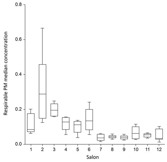 Daily median respirable PM concentrations (in mg/m3) in twelve sampled salons (Kruskall–Wallis p < 0.001). Boxes are interquartile ranges (IQR), whereas whiskers represent one more IQR.