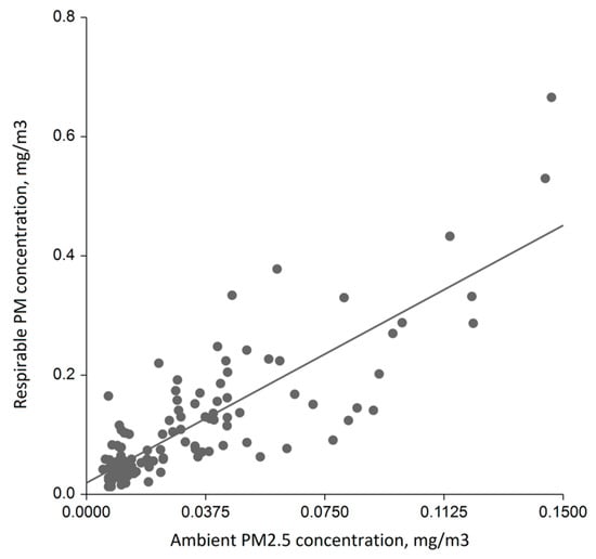 Scatter plot of respirable PM concentration in the indoor air of tested salons with regression line.