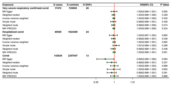 The results of TSMR analysis for all six methods are displayed in the forest plot in Figure 2. As is illustrated in Figure 2, no causal relationship between COVID-19 and ME/CFS was obtained for all five methods. The IVW results of TSMR analysis for COVID severity, hospitalization, and susceptibility were: severity (OR: 1.000, 95% CI: 0.999–1.000, p = 0.333); hospitalization (OR: 1.000, 95% CI: 0.999–1.001, p = 0.862); and susceptibility (OR: 1.000, 95% CI: 0.998–1.002, p = 0.998).