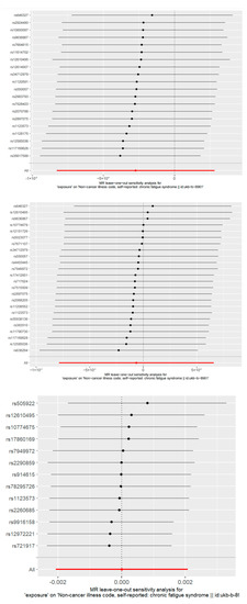The results of the “Leave-one-out” sensitivity analysis are shown in Figure 5, in order of severity, hospitalization, and susceptibility. The results showed that after removing each SNP in turn, the IVW results for the remaining SNPs were not significantly different from the results for all SNPs. After removing SNPs one by one, the overall error line of the results did not change much, and the confidence intervals did not change much, so the removal of each SNP did not affect the results, indicating that the TSMR analysis was robust.