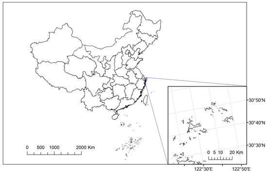 Shengsi County [37] was selected as the research site, and it is an island area under the jurisdiction of Zhoushan City, Zhejiang Province. Located to the east of Hangzhou Bay, southeast of the Yangtze River Estuary, between 30°24′ to 31°04′ north latitude and 121°30′ to 123°25′ east longitude, it is in the eastern part of Zhejiang province and the northern part of the Zhoushan archipelago (see Figure 1). It consists of 630 islands, of which 16 are inhabited islands with more than 100 permanent residents. The total land and sea area of Shengsi County is 8824 square kilometers, and nearly 99% of this consists of the sea. The county governs 3 towns and 4 townships, with a registered resident population of 72,534 as of the end of 2021. It is one of the island counties with a severe freshwater shortage in China, and the average precipitation over the years is 1105.8 mm. The lack of freshwater resources has become an essential factor restricting local economic development and the improvement in living standards. To solve this problem, a reverse osmosis seawater desalination system with a daily output of 500 tons was established in 1997, making Shengsi County the first area to use desalinated seawater as drinking water in China.