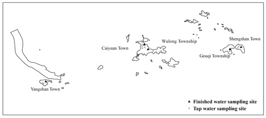 Another group from the same team carried out water boron monitoring from May 2015 to April 2016. During the monitoring period, samples were taken 12 times in total once per month. A total of 5 finished water and 13 tap water sampling sites were set in 5 towns, including Caiyuan Town, Yangshan Town, Shengshan Town, Gouqi Township, and Wulong Township (See Figure 2). According to the different water sources, three types of water (reservoir water, desalinated water, and mixed water) were collected within the corresponding supply time.