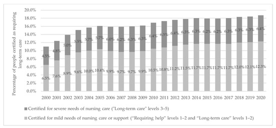 - Ministry of Health Labour and Welfare, Status Report on Long-Term Care Insurance. 2020. Available online: https://www.mhlw.go.jp/toukei/list/84-1.html (accessed on 26 January 2023). (In Japanese).