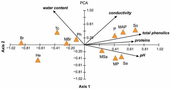 Principal component analysis (PCA) of the physicochemical properties of honeys tested synthetically showed their diversity depending on type. The eigenvalues of the first two axes were 2.47 and 1.13. The first axis explained over 49% and second axis over 22% of the variability of the analyzed data/physicochemical properties of studied honeys, and all four axes over 98%. This proves the major role axes 1 and 2 play in ordering the variables and determining the factors responsible for the distribution of honey types in the ordination diagram (Figure 1). All the variables analyzed, except for protein content for axis 2, were statistically significant at the level of p < 0.05. The ordination diagram showed two main trends of the variation in the physicochemical properties of the tested honey (Figure 1). The first one was related to the first axis and positively correlated with all variables tested, except the water content. The strongest correlation with this axis was shown by total phenolics, pH and protein content. This axis determined the gradient of the content of the analyzed properties in the honey types. Group I of the studied honeys (right side of the ordination diagram) represents an increasing content of total phenolics, pH, and protein content, starting from honeydew (So), multifloral (MAP), multifloral (MP), plum (P) and willow (Sa) honey. Group II (left side of the PCA diagram) was negatively correlated with the first axis and characterized by a high water content and lower content of the phenolics, proteins and pH values. This group of honeys includes rapeseed (Br), sunflower (He), lime (Tc), multifloral (MBr) and phacelia (Ph). The second axis of the PCA ordination diagram was strongly and positively correlated with electrical conductivity and water content, and the second axis determined the gradient of replaced variables in the studied honeys (Group III). The water content increased from the multifloral (MP) (14.67%) and willow (Sa), multifloral (MSa) and sunflower (He) (located under the second axis and negatively correlated with it) to multifloral (MAP), multifloral (MBr), and lime (Tc), positively correlated with the discussed axis, where the highest content of water was recorded. Honeys exhibiting highest conductivity are: honeydew (So), multifloral (MSa), lime (Tc) and phacelia (Ph) (Figure 1).