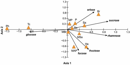 Axis 1 is positively correlated with all the variables tested, except the glucose content. The first axis determines the falling share of glucose in the honey types form the right side of the PCA diagram for sunflower (He), willow (Sa), multifloral (MP) and plum (P) to multifloral (MAP) in the middle, and lime (Tc), phacelia (Ph) on the left side. In relation to the content of other sugars, axis 1 is positively correlated with them. The strongest correlation with sucrose and rhamnose is observed and depicted by the axis showing a rising gradient of these sugars from rapeseed (Br), willow (Sa) and multifloral (MSa) to lime (Tc) and phacelia (Ph).