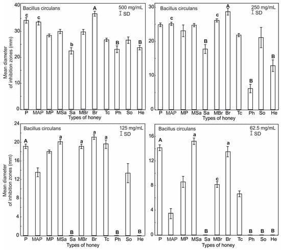 The antimicrobial activity of the honey samples was expressed by the inhibition of the growth of the tested bacteria around the wells on the agar medium, and it varied (Supplementary Materials Figure S1). The Gram-positive bacteria B. circulans proved to be the most sensitive to the activity of the honeys. The inhibition zones of bacterial growth were observed in all concentrations (62.5–500 mg/mL) in seven honey samples: plum (P), rapeseed (Br), lime (Tc) and multifloral (MBr, MAP, MP, MSa). In the case of three honeys—willow (Sa), phacelia (Ph), and sunflower (He)—no activity against B. circulans was found at concentrations of 125 and 62.5 mg/mL. On the other hand, honeydew honey (So) did not inhibit bacterial growth only in the concentration of 62.5 mg/mL. Taking into account the antibacterial activity observed after the use of the lowest concentration of honeys (62.5 mg/mL), it should be stated that the following honeys proved most effective against B. circulans: multifloral (MSa), plum (P) and rapeseed (Br) (growth inhibition zones of 15.22, 14.17, 13.55 mm respectively).