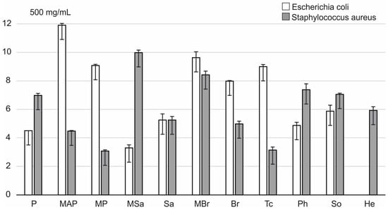 Similarly, only at the concentration of 500 mg/mL did the tested honeys inhibit the growth of Gram-negative bacteria E. coli. The largest zones of growth inhibition (9.6–11.9 mm), and thus the highest activity, were recorded for the following honeys: multifloral MBR and MAP. The exception was the sunflower honey (He), which showed no activity against this bacteria (Figure 5).