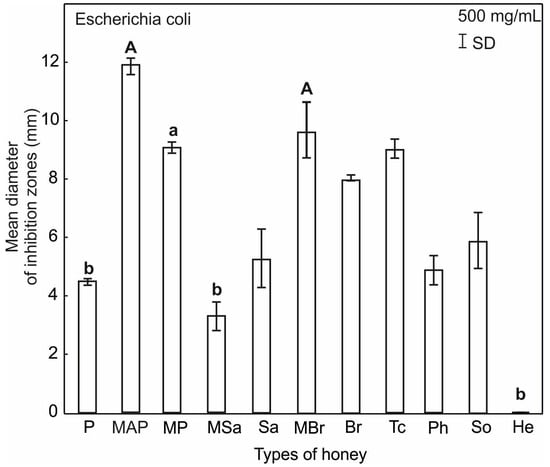 Results of ANOVA Kruskal–Wallis H test for the mean inhibitory activity of all tested honey types against E. coli. Statistical differences are indicated by different letters and their significance at p ≤ 0.001 with capital letters (A), p ≤ 0.05 with small letters (a). Upper and lower case letters above the bars indicate different levels of statistical significance.