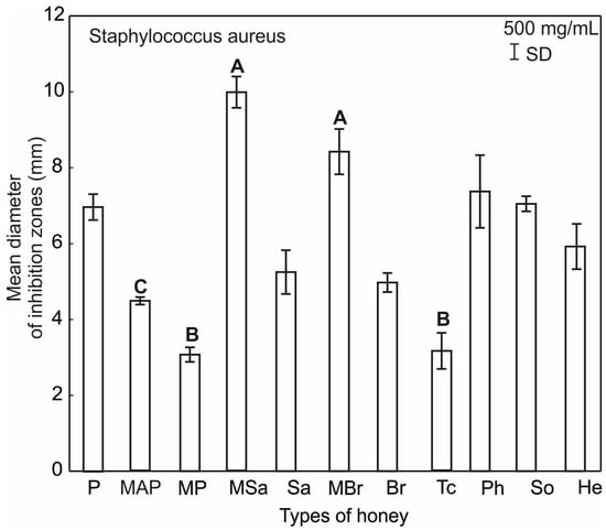 It should be noted that the tested honey varieties showed significantly lower activity against other Gram-positive bacteria used in the experiments, i.e., S. aureus. In this case, the inhibition zones of bacterial growth were observed only after the application of 50% honey concentrations. The growth of S. aureus was most strongly inhibited by these honeys: multifloral MBr (8.42 mm) and multifloral MSa (9.97 mm) (Figure 4).