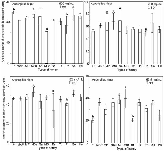 On the other hand, the tested honey varieties effectively inhibited the growth of A. niger (Supplementary Materials Figure S2). The maximum antifungal activity was found in all honey samples at the concentration of 500 mg/mL in the range from 62 to 99.25 µg/mL based on the properties of amphotericin B (µg/mL). At this concentration, the most active honeys were multifloral (MSa), plum (P) and honeydew (So), which differed significantly from multifloral (MBr) and phacelia (Ph) honeys (Figure 7). At a lower concentration (Figure 7), the properties of multifloral (MP), multifloral (MSa) and willow (Sa) honeys are comparable and significantly different from phacelia (Ph). At the next concentration, i.e., 125 mg/mL (Figure 7), multifloral (Msa) and honeydew (So) honeys retained antifungal properties, being significantly different from rapeseed (Br) and phacelia (Ph). At the lowest concentration (Figure 7) willow (Sa) and multifloral (MBr) honeys were most active, differing from plum (P) and rapeseed (Br), which showed lowest antifungal activity.