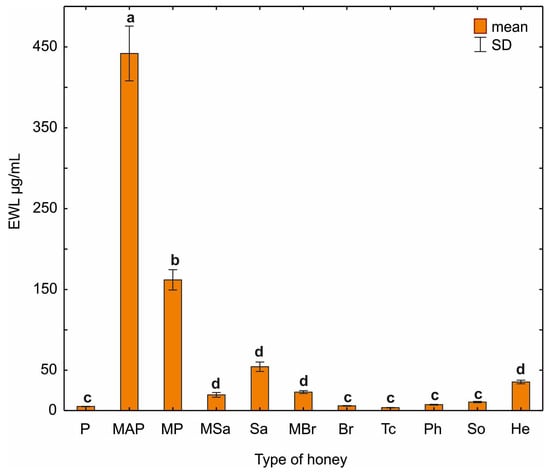 In subsequent experiments, lysozyme-like activity was checked by applying the tested honey samples to plates containing M. lysodeikticus according to the procedure of Mohrig and Messner []. Lysozyme-like activity was found in all the tested honeys. The highest lysozyme-like activity corresponding to the activity of 447.26 ug/mL and 159.74 ug/mL EWL was measured in multifloral honeys MAP and MP. The other varietal honeys have low lysozyme-like activity. Comparable values were obtained for the following honeys multifloral (MSa), willow (Sa), multifloral (MBr), sunflower (He) and plum (P), rapeseed (Br), lime (Tc), phacelia (Ph), honeydew (So), which were statistically significantly different from other samples (Figure 8).