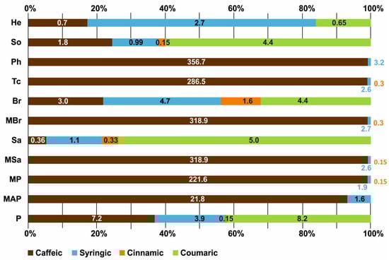 The findings are presented in Table 4 and Figure 9. The presence of caffeic and syringic acid in various amounts was found in all tested honeys. Some honeys identified coumaric acid (in 45% of samples) and cinnamic acid (in 73% of samples). The highest content of caffeic acid was observed in the following honeys: phacelia (Ph)—356.72 µg/g, multifloral Sa (MSa) and multifloral Br (MBr)—318.9 µg/g, and cinnamic acid in willow honey (Sa)—11.9 µg/g. The content of coumaric and syringic acid in the honey samples did not exceed 10 µg/g.