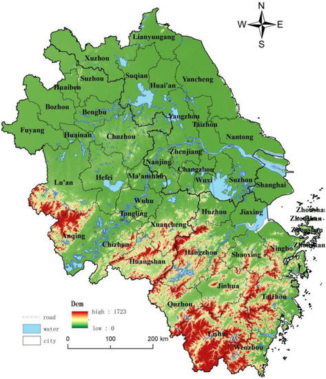 The data for this study consisted of the following six main categories. (1) Remote sensing monitoring data of the Yangtze River Delta for 2000, 2010, and 2020 from the Data Center for Resource and Environmental Sciences, Chinese Academy of Sciences (http://www.resdc.cn), accessed on 5 July 2022. In the acquisition of land use status map from Landsat TM/ETM+/OLI remote sensing images, the primary processing steps include image pre-processing and manual visual interpretation. According to the Classification of Land Use Status (GB/T21010-2017), we identify land use types into six categories: arable land, forest land, grassland, water, construction land, and unused land. The overall accuracy of the study area reaches above 80%, and the Kappa coefficient is above 0.7. (2) Socio-economic statistics: The socio-economic data used in this paper come from the Shanghai Statistical Yearbook (2001~2021), Jiangsu Statistical Yearbook (2001~2021), Zhejiang Statistical Yearbook (2001~2021), Anhui Statistical Yearbook (2001~2021), China County Statistical Yearbook (2001~2021), and China City Statistical Yearbook (2001~2021). (3) DEM data were obtained from the geospatial data cloud (http://www.gscloud.cn/ accessed on 29 November 2022) with 90-m resolution. (4) The road data are obtained from the ‘National Earth System Scientific Data Sharing Platform-Yangtze River Delta Scientific Data Center’ (http://www.geodata.cn), accessed on 5 July 2022 and the open-source wiki map OpenStreetMap (OSM), with a spatial resolution of 1:250,000. (5) The data of administrative divisions in the Yangtze River Delta region are obtained from the China National Basic Geographic Information Center (http://ngcc.sbsm.gov.cn), accessed on 5 July 2022. The study considers the adjustment of administrative divisions and the continuity of the above data. Therefore, we choose the latest administrative divisions for the consolidation process.