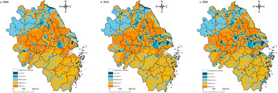 The living functions of the Yangtze River Delta region were low during the study period, with an overall high in the north and a low in the south. This spatial pattern may be related to the fact that the north is plain and the south is more hilly and mountainous, thus influencing the regional distribution pattern of rural settlements. In general, the high-value and higher-value area of living function continued to expand during the study period. The spatial distribution was similar to the characteristics of the high-value and higher-value area of the non-agricultural production function. However, southern Jiangsu’s contiguous spread of living functions was more pronounced. At the same time, Suqian and Huai’an in the northern region and the coastal living functions in southeastern Zhejiang have also grown, mainly due to the relatively concentrated rural settlements. Specifically, the high-value and higher-value areas in 2000 are more focused in Shanghai, Suzhou-Wuxi-Changzhou, and Huai’an and Suqian cities in northern Jiangsu, with an area share of 5.46%. The medium-value areas are mainly distributed north of Anhui plain, accounting for up to 19.75%. However, the living functions of these areas are yet to be improved because the public infrastructure and public services in urban and rural areas are not perfect. Low-value and lower-value areas were mainly distributed in southern Anhui’s mountainous regions, southern Zhejiang’s central mountainous areas, and the hilly areas of the middle mountains of western Zhejiang, with an area share of up to 74.80%. These areas are widely distributed with forest, grassland, and other ecological lands and have large topographic undulations and geological disasters. In 2010, the high-value and higher-value areas changed faster, and the north-south divergence persisted. Shanghai and Suzhou-Xichang areas were visible as apparent intensification, and the area share was raised by 1.17%. The middle area had different clusters in Fuyang, Bozhou, Suizhou, Huaibei, and Bengbu in northern Anhui, and the proportion shrunk to 16.20%. The spatial distribution of lower-value and low-value areas is stable, and the proportion is still high (77.17%). In 2020, the high-value and higher-value areas expanded again, and the area share rose to 7.28%. The continuous trend of the core area of the Yangtze River Delta was highlighted, and the point-like strengthening of the northern part of Jiangsu Province (Xuzhou, Huai’an, Suqian) was gradually revealed. The medium zone has mostly stayed the same as the previous year and was still concentrated in northern Anhui. The range of low-value areas and low-value zones expanded, and the proportion increased to 78.46%. The living functions around ecological lands, such as water, woodland, and grassland, were reduced significantly (Figure 5).