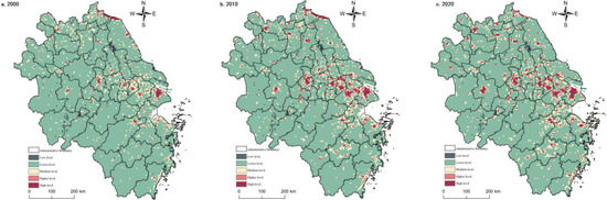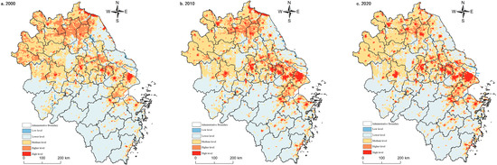 Figure 5. Spatial pattern of living functions in the Yangtze River Delta from 2000 to 2020.