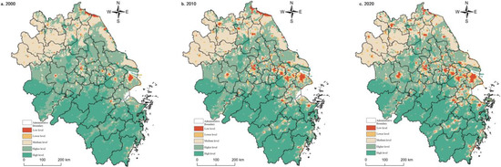 The ecological function of the Yangtze River Delta region is overall better but with a weakening trend during the study period. Spatially, the high south and low north distribution, such as the Dabie mountainous area, the mountainous area of south Anhui, the hilly area of west Zhejiang, the mountainous area of south Zhejiang, the ring of Taihu Lake, Hongze Lake, the coastal area of north Jiangsu and the estuary of Yangtze River had the most apparent decreasing trend. This phenomenon indicated that urbanization had a more substantial effect on ecological and environmental stress. In 2000, the proportion of high and higher value areas reached 46.41%, with a cluster-like appearance. In 2000, 46.41% of the high and higher-value regions were clustered in Zhejiang, southern Anhui, and central Jiangsu. The medium-value areas were more extensive and widespread, mainly in the northern Anhui and Jiangsu clusters. The lower-value and lower-value areas were scattered in Shanghai, Suzhou, Xichang, and Nanjing sporadically, with an area of 22.89%. In 2010, the higher-value and higher-value regions did not change much compared to the previous year, and their distribution was roughly consistent with the ecological land area. The medium-value areas shrank by 6.61%, mainly due to the expansion of central cities such as Shanghai, Nanjing, Hangzhou and Suzhou, Wuxi, and Changzhou to the periphery. The area share of low-value and lower-value areas increased by 2.2%, consistent with the central city expansion range. In 2020, the ecological function of the Yangtze River Delta region continued to decline, maintaining a medium level overall, and regional differences are still prominent, with high-value and higher-value areas locked in the core areas of mountains and hills, rivers, and lakes. However, the area share was compressed to 48.95% due to increased human activities. The middle zone did not change much, but the low-value and lower-value zones expanded near the central city, north of Anhui and north of Jiangsu (Figure 6). The strength of ecological functions was very dependent on the natural background environment. However, the increase in human activities, intensity, and disturbance inevitably brought a series of ecological and environmental problems, so the gradually increasing social and human factors of coercion should be addressed.