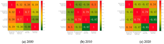 Spatial heterogeneity existed among the four functions in the Yangtze River Delta region, and the overlapping and competing coexistence of functions would result in concurrent synergy/balance relationships [65], which would increase multifunctionality and reduce trade-offs for sustainable regional development. This study diagnosed the synergistic/balancing relationships between functions and their degree of action based on the correlation coefficients’ positive and negative absolute magnitude. Precisely, the agricultural production function and non-agricultural production had a gradually increasing balance relationship, and the correlation coefficient decreased sharply by 0.77 during the study period. This phenomenon was due to the uncontrolled expansion of urban and rural construction land encroaching on agricultural lands, such as arable land, grassland, and garden land. Thus, the agricultural production function declined while non-agricultural production increased rapidly. The agricultural production function also had a strong trade-off relationship with the subsistence function, and the negative correlation strengthened significantly and accelerated. In contrast, the agricultural production function had a weak positive correlation with the ecological function, with a smooth trend of synergistic development between the two. This phenomenon could indicate that arable and garden ecosystems provide stable biological products such as food and fruits for humans while providing new semi-natural habitats. The story of non-agricultural production and living functions were closely related and had always shown a strong positive correlation during the study period, but the synergistic relationship between them decreased slightly in the more rapid development stage, and the human-centered development approached and orientation still need attention. The trade-off relationship between non-agricultural production and ecological functions fluctuated and increased to a peak (−0.53) from 2000 to 2010, and with the implementation of policies, such as environmental civilization construction, the negative relationship between them with the performance of procedures, such as the construction of ecological civilization, the negative correlation between the two had become weaker. The trade-off between living and ecological functions has been increasing, and the intensity of human activities in the Yangtze River Delta region has inevitably disturbed important ecological land, making the environmental service function weaker (Figure 7). In conclusion, agricultural production had a strong trade-off relationship with non-agricultural production and living functions, and agricultural production and ecological functions developed synergistically in general. In contrast, the synergy effect between non-agricultural production and living functions gradually increased, and there was a trade-off between non-agricultural production and living functions and ecological functions.