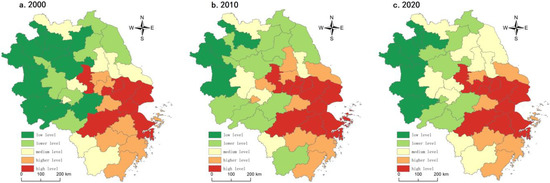 From 2000 to 2020, the coefficient of variation and the extreme difference in the economic development level of the Yangtze River Delta fluctuated slightly. However, it always maintained a high level, with the mean values of the coefficient of variation and the extreme difference being 0.6412 and 2.220, respectively, indicating that the regional economic development level was polarized, spatially unbalanced, and geographically different. Specifically, in 2000, there were 11 municipalities at low economic development levels, widely concentrated in northern and western Anhui. Seven towns were at a lower level of economic development, mainly distributed in two major clusters north of Jiangsu Province and the Jianghuai region of Anhui Province. Eight medium-level municipalities were primarily distributed in central Jiangsu and southeastern Zhejiang. There were eight municipalities in the higher level name, mainly distributed in Zhenjiang, Huzhou, Shaoxing, Jinhua, Taizhou, and other places. The high-level areas were primarily concentrated in Shanghai, Nanjing, Hangzhou, Suzhou, Wuxi, and Changzhou. In 2010, the overall economic level tended to be better. The number of low-level units decreased to four, mainly in Bozhou, Suizhou, Fuyang, and Luan in northern and western Anhui. These places had an outflow of population, low industrial structure, far from regional growth poles, and a lack of internal and external power pull for economic development. The lower unit level had increased, with a total of 13, mainly in southern Anhui, eastern Anhui, and northern Jiangsu mountain areas. These areas were either constrained by deviations in natural factor endowments (undulating terrain), unsatisfactory location conditions (lack of transportation routes), or regional development strategies that did not focus on economic development: five medium-level municipalities, mainly Xuzhou, Hefei, Taizhou, Wuhu, and Quzhou. However, there were lagging effects, such as capital investment and industrial restructuring, so continuously consolidating the development effect was still necessary. In 2020, the economic development level would be stable, but the regional differences were still enormous. Seven cities with low economic development would be concentrated in the northern Anhui and Dabie Mountains contiguously and fall into the “poverty trap”. Lower-level areas decreased to 8, primarily located in the mountainous regions of southern Anhui, the junction of Anhui and Jiangsu, and northern Jiangsu, such as Huangshan, Chuzhou, Suqian, and Lianyungang. The medium level increased significantly to 10 units, mainly located in central Jiangsu, Hefei-Bengbu, Xuzhou, Quzhou, and Lishui. Higher and high-level areas remained stable, mainly in Hangzhou, Jiahu, Suzhou, Xichang, Nanjing, and Shanghai (Figure 8).