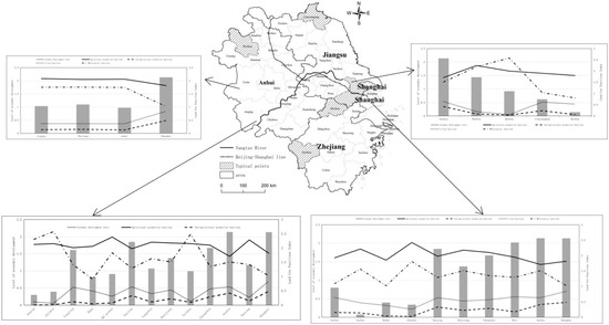 Gradient change: The evolution of land use function and regional economic and social development strongly coincided. For this reason, a typical sample belt in the Yangtze River Delta region was selected in a ‘point-line surface’ combination to analyze the spatial heterogeneity and variability of regional development in depth (Figure 9).