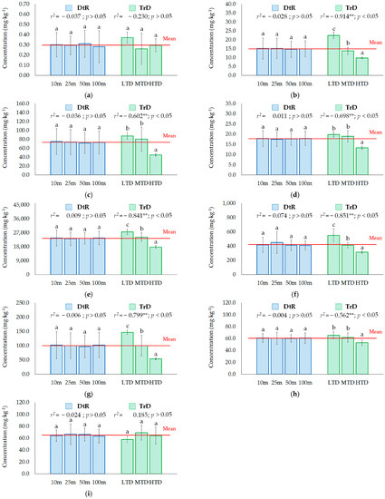 Soil concentrations (mg·kg−1) of Cd (a), Co (b), Cr (c), Cu (d), Fe (e), Mn (f), Ni (g), Pb (h), and Zn (i) (Letters a, b, and c indicate significant differences at p < 0.05; ** correlation is significant at the 0.01 level (2-tailed)). Abbreviations are as follows: DtR, the distance to roads; TrD, the traffic density; LTD, low traffic density; MTD, medium traffic density; HTD, high traffic density.