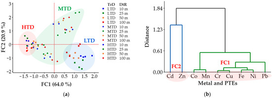 Score plots (a) and dendrograms (b) of the factor analysis of metal and PTEs’ contents in soils of orchards. Abbreviations are as follows: FC1, first factor; FC2, second factor; DtR, the distance to roads; TrD, the traffic density; LTD, low traffic density; MTD, medium traffic density; HTD, high traffic density.