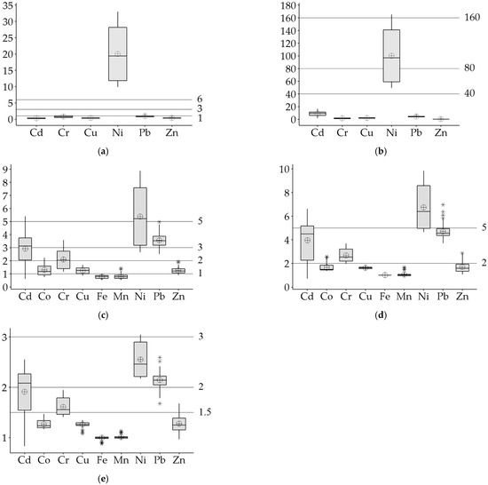 Individual and complex indices proposed by Kowalska et al. [31] for the environmental and ecological assessment of PTE contamination in agricultural soils were also used in this study. These indices refer to individual or the sum of all PTEs tested, without or with reference to global and/or local background levels of metals, and in some cases include toxicity measures or even soil physicochemical parameters. The ranges and classifications of environmental and ecological indices are given in Table S3.
