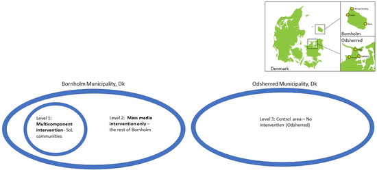 The rest of Bornholm was only exposed to this mass media intervention (level 2) and, therefore, the design provides the opportunity to investigate the effect of different levels of intensity of the intervention. This is illustrated in Figure 1.
