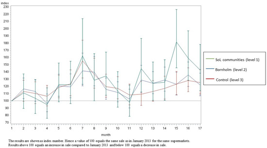 Effect of the intervention: comparing the development in the Coop SoL supermarkets (multi-component intervention, level 1), other Coop supermarkets on Bornholm (mass media intervention only, level 2) and Coop supermarkets in the control area (Odsherred municipality, no intervention, level 3).