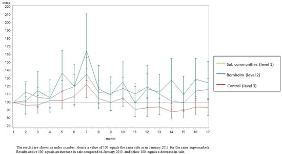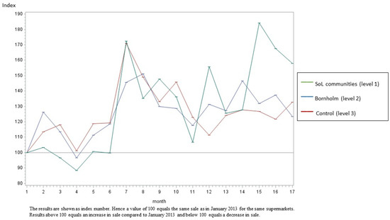 We used a random effect for supermarket to allow for heterogeneity among supermarkets, and an autoregressive AR1 correlation structure to account for larger similarities of observations closer in time on the same supermarket. We, furthermore, took into account the seasonal variation in sales during public holidays, as this variation might differ between local areas. For small intervention effects, the intervention effect on the logged index scale can be approximately interpreted as the proportional change in index number during the intervention period. The analysis was performed using the proc mixed procedure in SAS. Effects of the intervention were estimated by comparing the development from the first month (January 2013) to the average sale during the last three months (April, May and June 2014) of the intervention in the SoL supermarkets (level 1) and other supermarkets on Bornholm (level 2) compared to the control area (level 3).